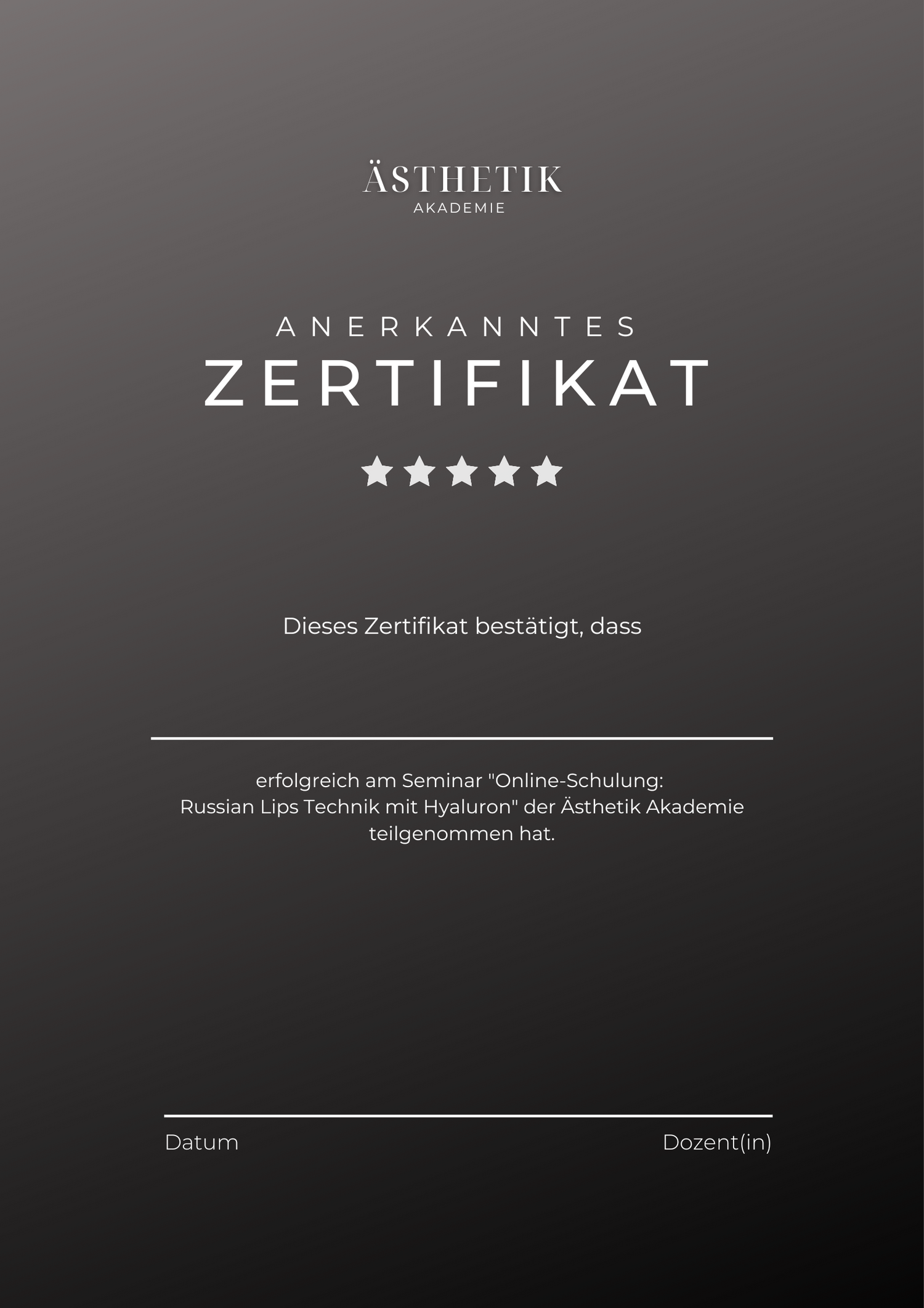 Nach erfolgreichem Abschluss des Seminars erhalten Sie innerhalb weniger Tage Ihr offiziell zertifiziertes Zertifikat als PDF per E-Mail. Das Zertifikat bestätigt Ihre Teilnahme und die erworbenen Kenntnisse und Fähigkeiten in der medizinischen Ästhetik.